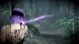 Ayane is hired to investigate the disappearance of a young woman by the name of Tsumugi, who was last seen headed towards Mt. Hikami, a place known for people to go to with the intent of suicide. When Ayane arrives on scene she uses an enchanted bracelet, that creates a glowing purple string that allows her to follow Tsumugi's trail and find her. She begins investigating the last place where Tsumugi was seen as shown by the bracelet, before being attacked by a hostile ghost. She attempts to fight them off with her Fuma Kodachi, however her weapons have no effect on the dead. She is then jumped by a mass group of spirits, before the scene fades to black. Ayane is then seen crawling away from the scene, wounded and unable to stand, stating that her standard battle tactics will not work in this situation.