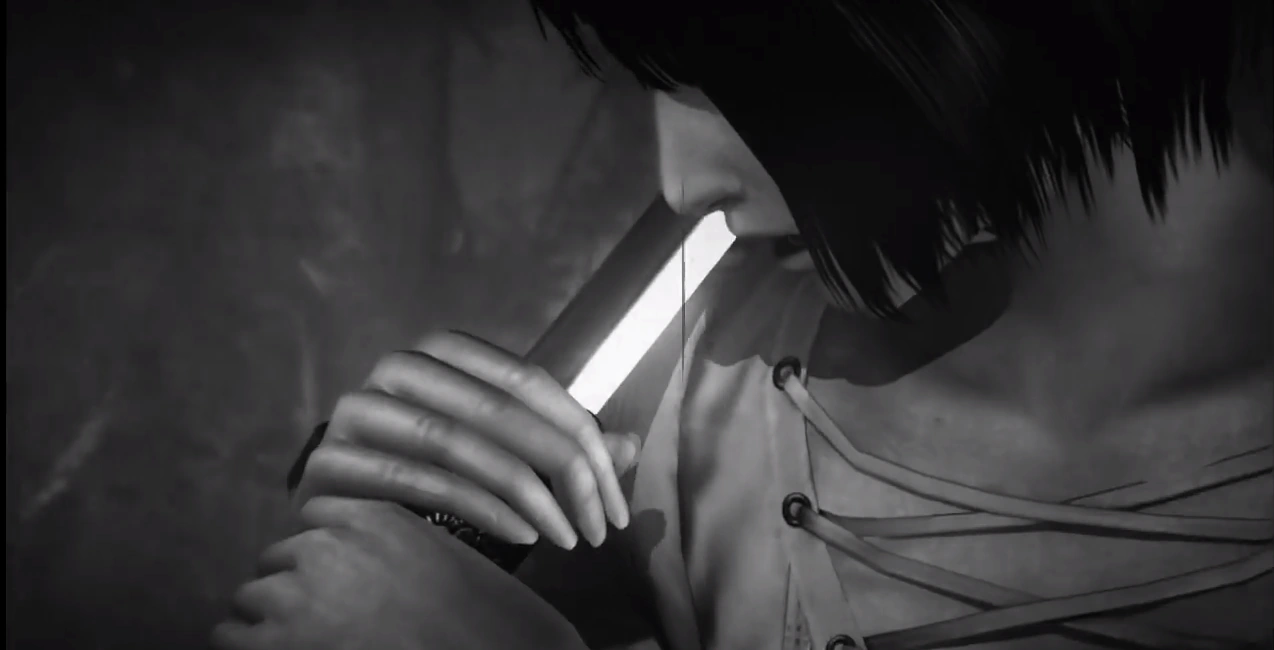 Fuyuhi typically first appears and engages with her bloody form. When bloody, Fuyuhi still has the basic charge shared with several other ghosts and will simply lunge forward. An indication that she will attack is if she bucks backward before suddenly stepping forward. Another tactic she may try is to hold her knife forward before teleporting a few times and finally charging towards the player. Unlike most ghosts, the bloody form's head cannot be zoomed into, instead, the player can only focus on her left hand, which is holding her blade. In her bloody form, Fuyuhi's movements are also more erratic, and she will stagger and stumble more often than in her normal form.